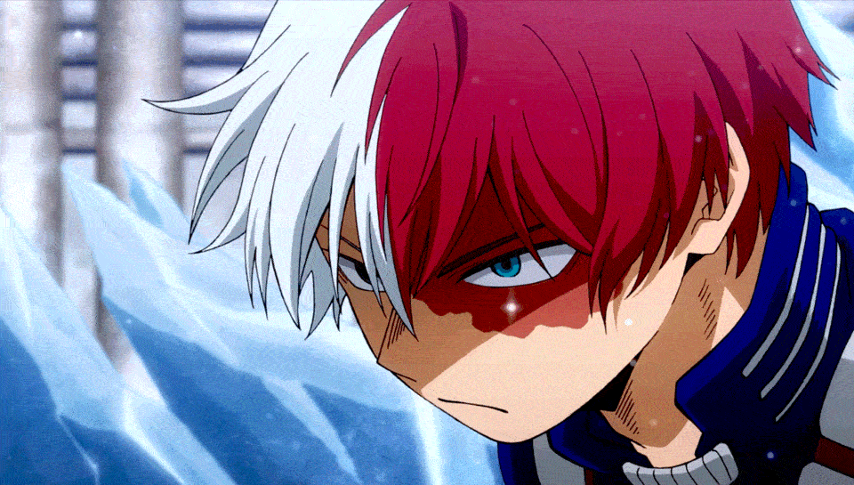 Sora’s hair color corresponds not only to her moods (normally ombré) but also her quirks. When using them, her hair changes from white (ice) to red (fire). She currently can’t use two quirks at once, yet. Here, her hair changes to red as she starts to use her fire quirk.